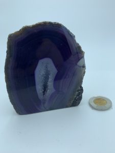 Agate is a stone of strength and courage; it tones and strengthens the mind & body, grounding and stabilizing emotions and physical energy.  The purple colour will help with intuition and clearing energies to keep yourself light.  This stone close to where you sit quietly or meditate will be ideal.  Face the crystal portion of the stone so it faces you as you sit or lie down.